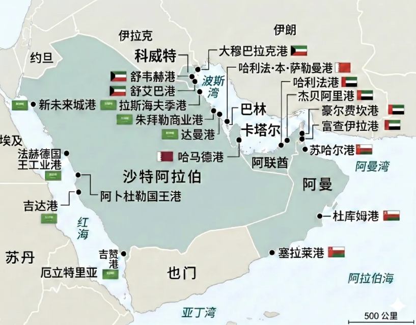 除了这些较大的港口,海湾地区重要的港口还有伊拉克的乌姆盖斯尔港(Umm Qasr)、卡塔尔的哈马德港(Hamad)、伊朗的阿巴斯港(Bandar Abbas),都是各国的海上门户。