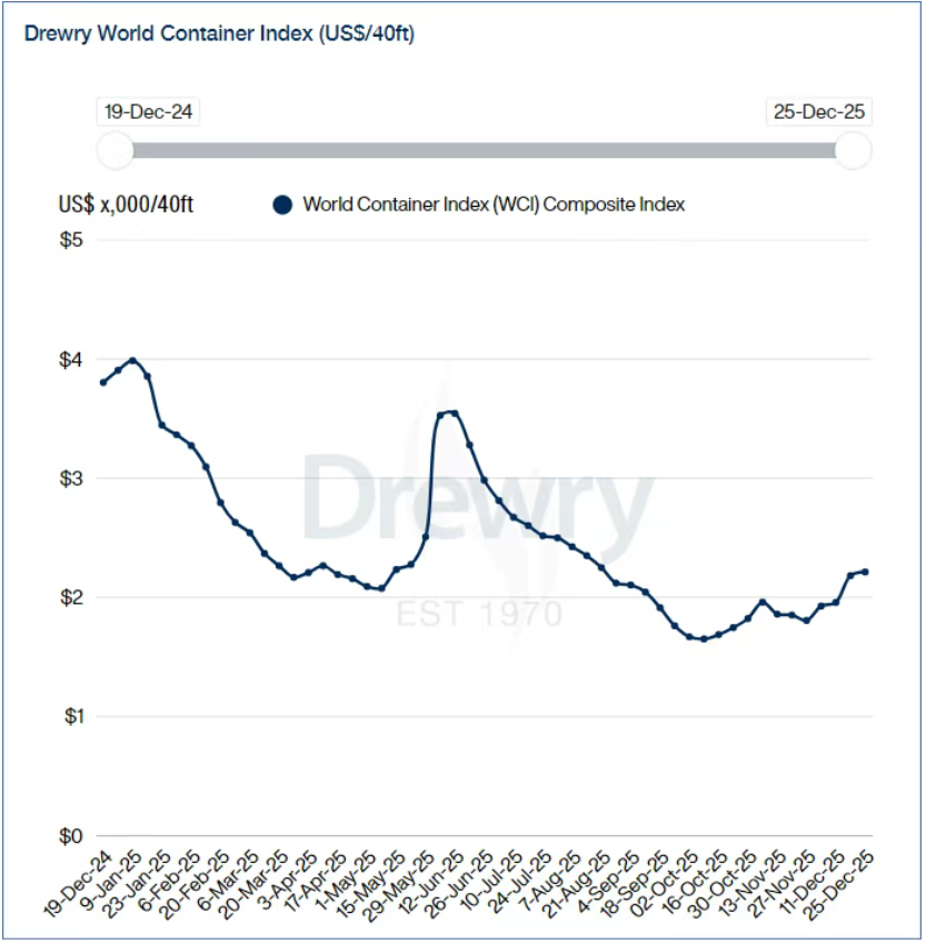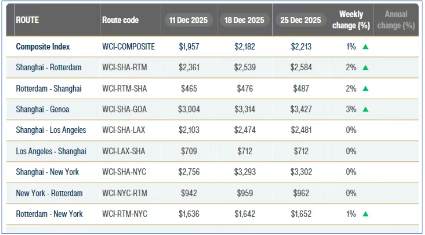 与此同时,截至12月25日,Drewry世界集装箱运价指数(WCI)涨1%至2213美元/FEU。
